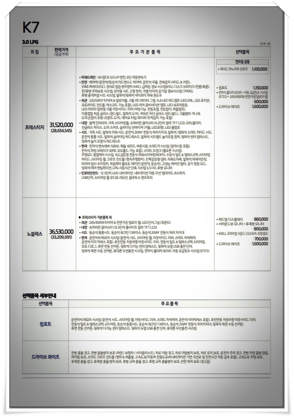 이번에 K7 가격표 3.0 가솔린 모델은 노블레스 등급 36,600,000원입니다.