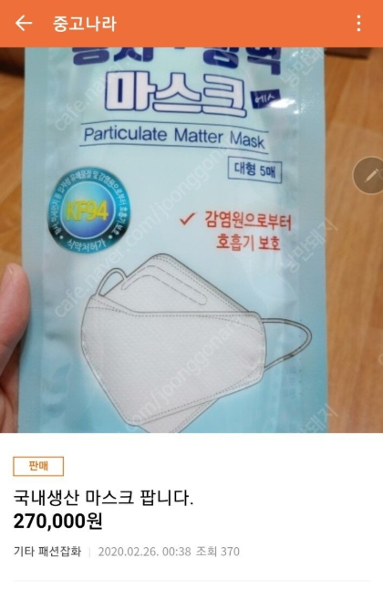 무튼 제 글을 보셨다면 절대 중고나라에서 마스크를 사지 않았으면 좋겠습니다. 인간적으로 호구는 되지 맙시다. 그리고 아마 알게모르게 본인도 진짠지 가짠지 모르고 사게 될 수도 있습니다. 기억해보세요. 분명 작년 미세먼지 때도 마스크는 고작해봐야 500원에서 2000원 남짓이었습니다. 물론 한 장당 말이죠.