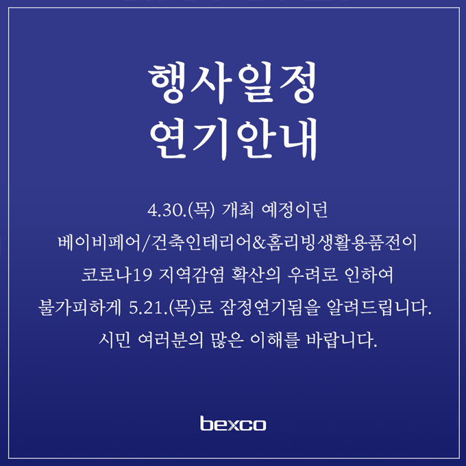부산 벡스코 - 어린이날 행사 취소, 부산베이비페어, 부산 홈리빙, 생활용품전, 부산 건축인테리어전 연기(5월 21일)