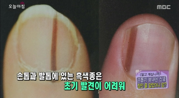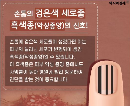 다시 돌아와서 영양소 부족 외 생기는 검은 세로줄은 무엇일까요? '흑색종' 이라고 불리우는 병입니다. 흑색종을 멍으로 착각하는 사람들이 매우 많습니다. 하지만 흑색종은 심각하게 봐야할 현상입니다. 흑색종은 주변 피부를 파괴하기도 하고 크게 들어가면 손가락, 손 그리고 끝으로는 온몸에 퍼질 수 있기 때문에 많이 위험한 현상입니다.